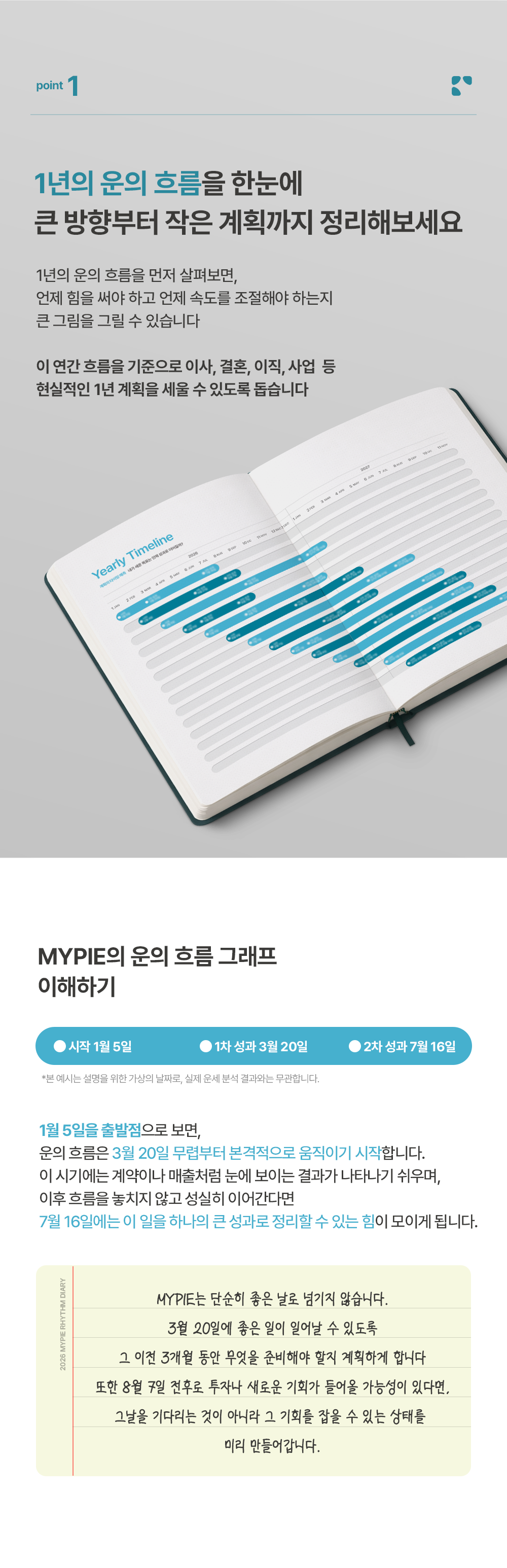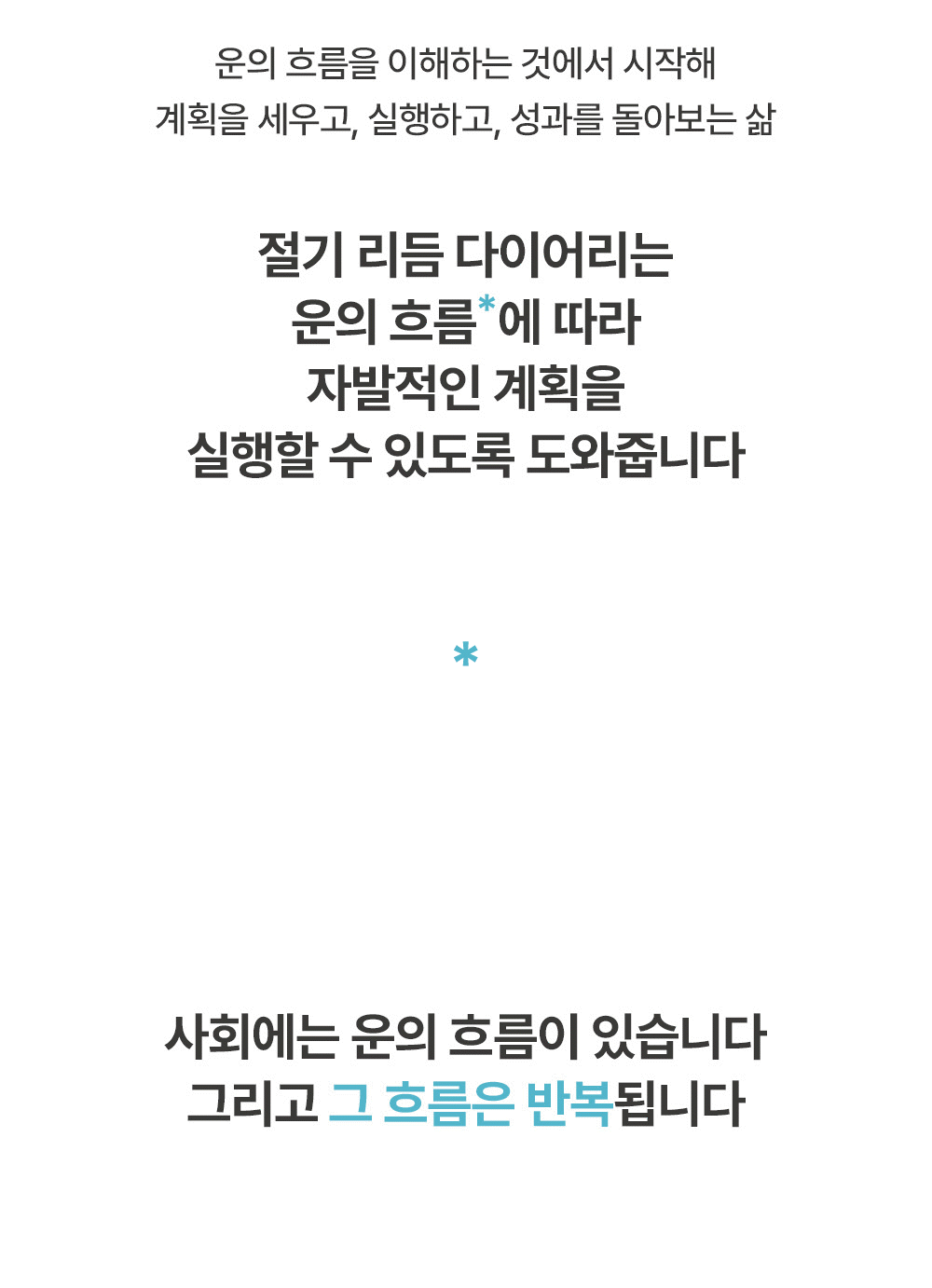 이 현상을 ‘지연’과 ‘지체’라는 일정 개념으로 정리합니다. 무언가 계획을 할 때, 시기를 보면서 성과를 내는 데 유리한 때를 살피면서 계획할 수 있도록 절기 과학 이론과 명리학 이론을 반영하여 만든 다이어리 입니다.